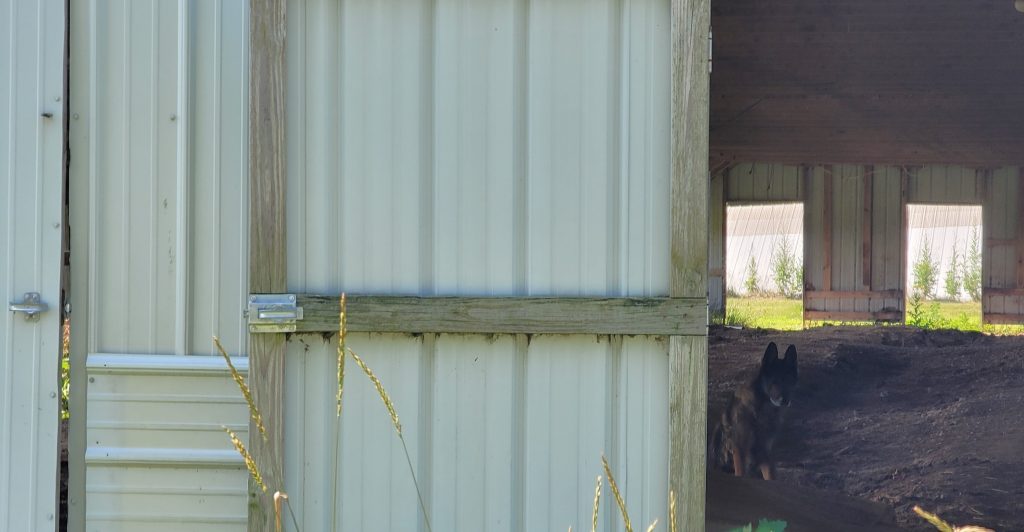 That’s not a mink! A look inside sheds at the Blanke-Wachter fur farm (Plymouth, Wisconsin) revealed sheds empty of cages, and a friendly dog.